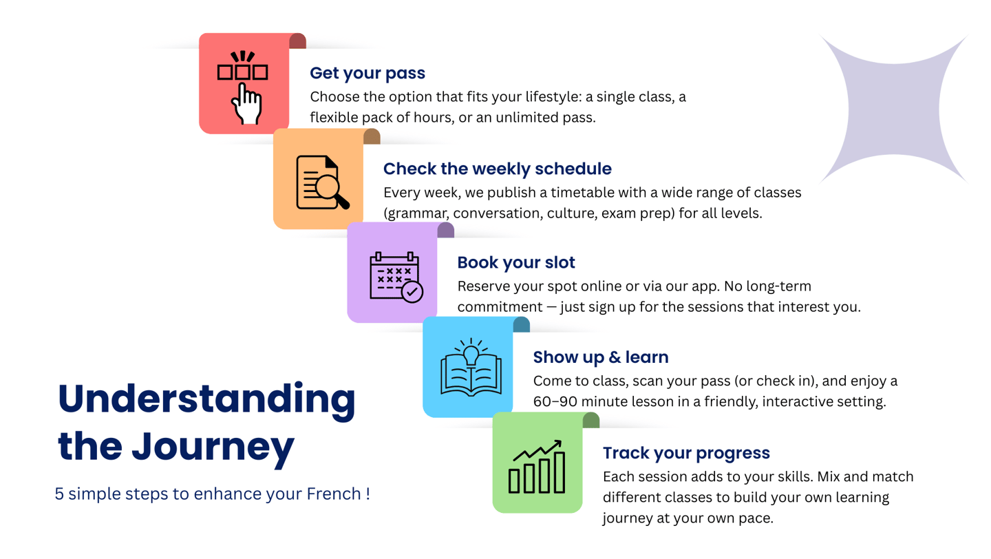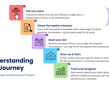 At French Gym, learning French is as flexible as a fitness club. Choose when to join, pick the classes that match your goals, and progress at your own pace. Whether you’re here for daily practice, cultural discovery, or exam preparation, our timetable is open — just drop in and learn.